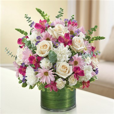 Sometimes all it takes is a simple gesture to bring back countless cherished memories. Our beautiful lavender and white sympathy arrangement filled with graceful lavender roses, alstroemeria and carnations, elegantly designed by hand in a graceful cylinder vase, is a touching tribute to a life well lived and the precious memories that will live on.